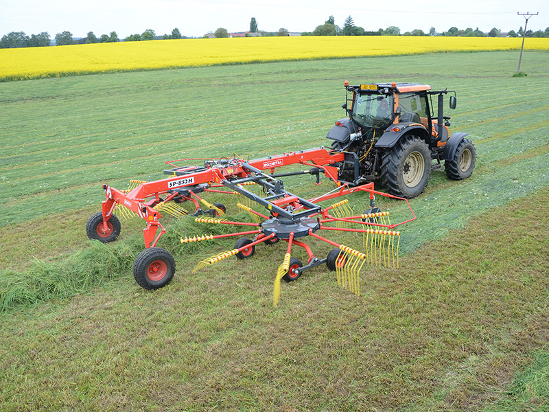 Dvourotorový shrnovač na prostřední řádek s hydraulicky nastavitelným pracovním záběrem až 8,5m.